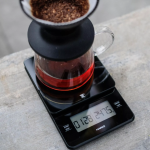 The scale can handle loads of up to 2,000 g and is ideal for drippers, French presses, and other brewing methods. The glass weighing surface is easy to clean and stain-resistant. Thanks to its compact size and low weight, you can easily pack it with you. It automatically turns off after 5 minutes of inactivity, saving battery life. It runs on 2 AAA batteries, so you can get it up and running in no time.