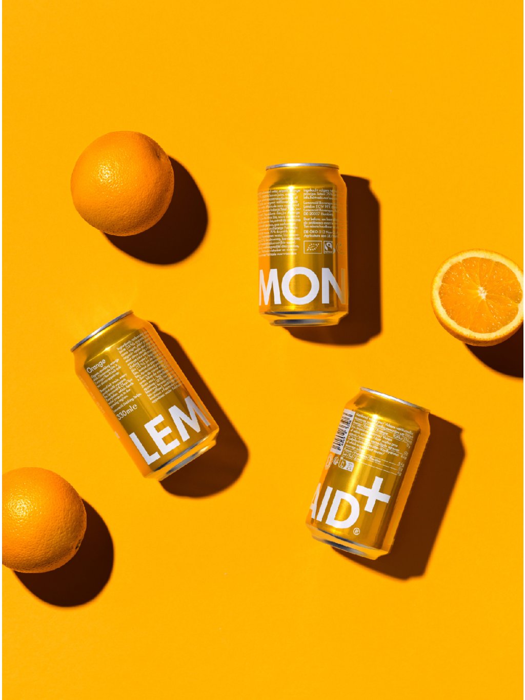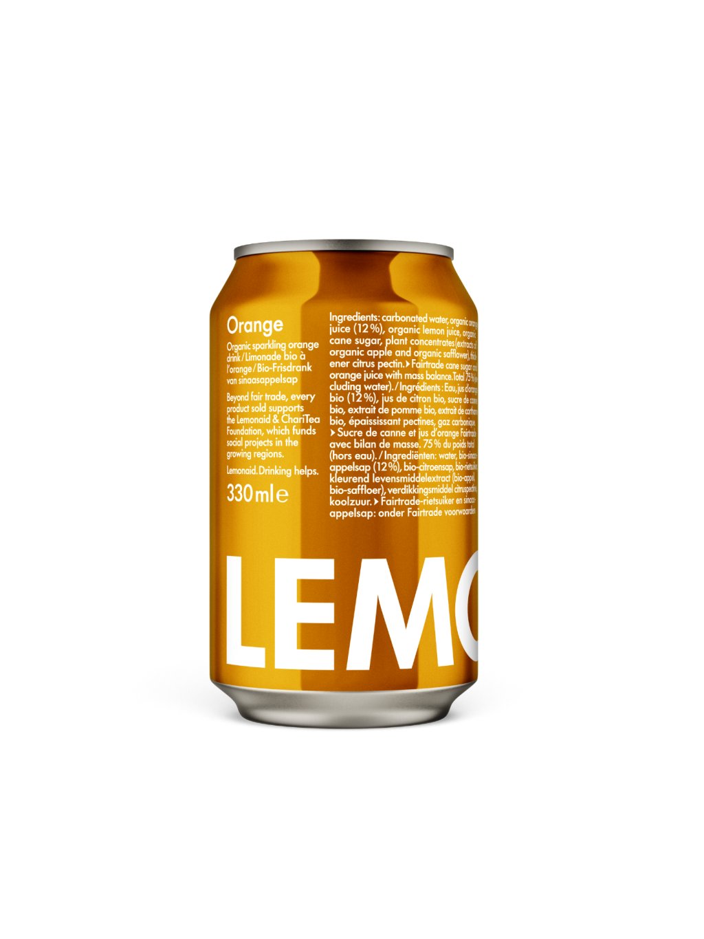 The original LemonAid,a Fairtrade orange sparkling non-alcoholic beverage, contains plenty offresh orange juice, sparkling water, and a touchof cane sugar.