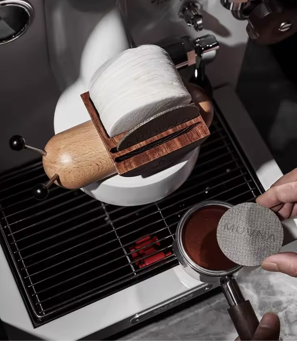 The special construction allows the puck screen to be stored stably so that it is not damaged and does not come into contact with dirt. The standaccommodates common puck screen diameters used in home and professional portafilters – typically 51 mm, 53 mm, and 58 mm. The handcrafted wooden finish also ensures that each piece is slightly different and retains its unique character. The wooden stand is not dishwasher safe – for a long service life, simply wipe it with a damp cloth from time to time and dry it immediately.