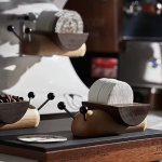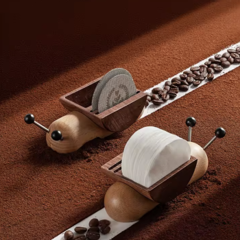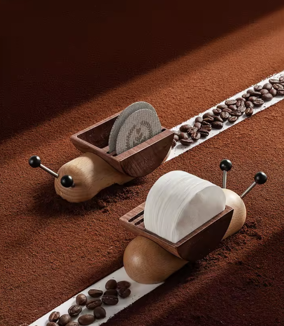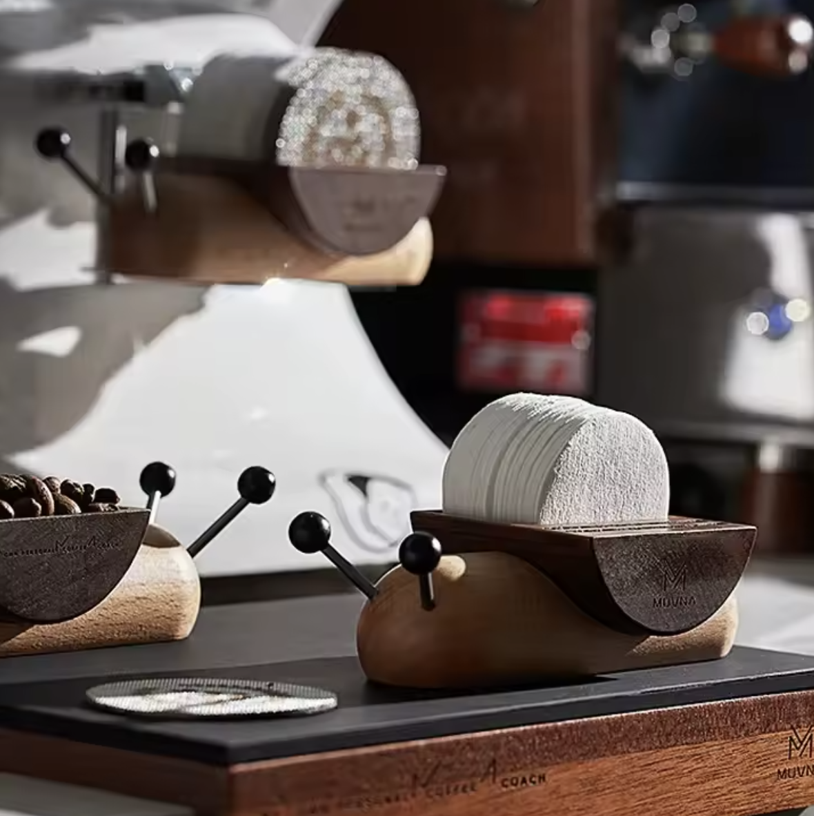 MUVNA Snail Puck Screen Storage is an elegant and practical accessory for anyone who wants to keep their barista corner tidy. It is made of solid wood, which gives the accessory a natural look and strength, and its shape is designed for safe storage of the puck screen. Thanks to its compact size, it fits easily on any worktop, and its playful little snail shape gives it a distinctive character, making it an aesthetic detail that complements your espresso setup.