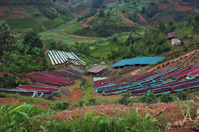 The processing method is honey, which is responsible for this coffee’s distinctive sweetness. After the husk is removed, a portion of the pulp remains on the bean, which influences the final flavor during drying. The beans are dried on African beds (raised structures for better airflow), in this case even on three levels. Drying takes several days to weeks and requires regular turning and monitoring to ensure the coffee doesn’t overdry or start fermenting uncontrollably. When done right, the result is worth it—more sweetness, a fuller body, and pronounced fruitiness.