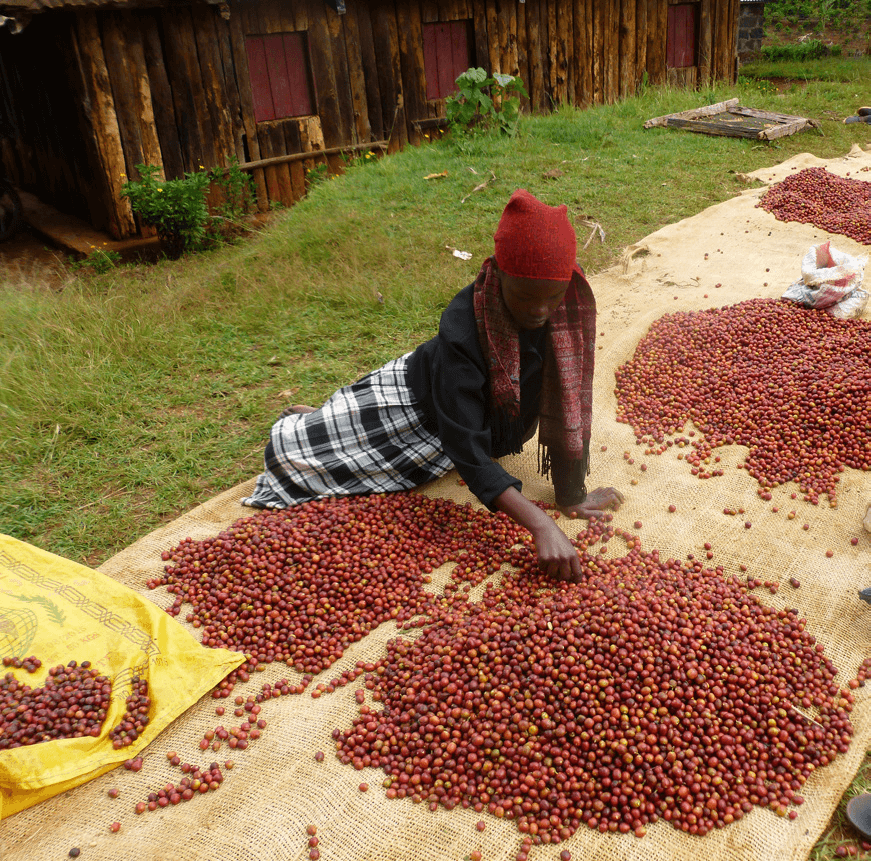 Processing is done using the classic washed method, which is common in Kenya but still unique in its precision. After harvesting, the cherries are sorted by hand, pulped, and left to ferment for 12-24 hours in concrete tanks. This is followed by washing in clean spring water and careful sorting by density. The beans are dried on raised African beds, where they are regularly turned for up to two weeks. The result is a bright and lively cup with precise clarity and a long, sweet finish.