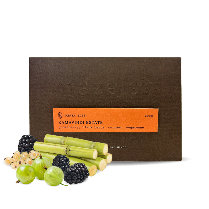 Full-bodied, energetic, and typically Kenyan – that's Kamavindi SL28 from Mazelab roasters. In the cup, it offers a distinctive combination of fresh gooseberry, ripe blackberry, white currant, and cane sweetness, which rounds everything off into a pleasant, delicate finish. This select coffee will delight anyone looking for distinctive fruity notes, bright acidity and high sweetness in a perfectly balanced ratio. It is a cup you will never forget – vibrant yet elegant, full of life yet sophisticated.